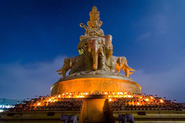 后换乘峨眉山景观光车(自理 90 元/人往返),前往峨眉山最高停车场 ——雷洞坪(50 公里),开始享受峨眉山大天然氧吧之旅,“一山有四季,十里不同天”的自然景色, 后步行前往接引殿,可乘坐索道(自理 120 元/人往返)前往峨眉山【金顶】蜀山之巅,云层之上;十 面佛像,舍身崖,云海,佛光等自然人文景观。在全世界最大的礼佛广场朝拜 48 米高的【十方普贤】;